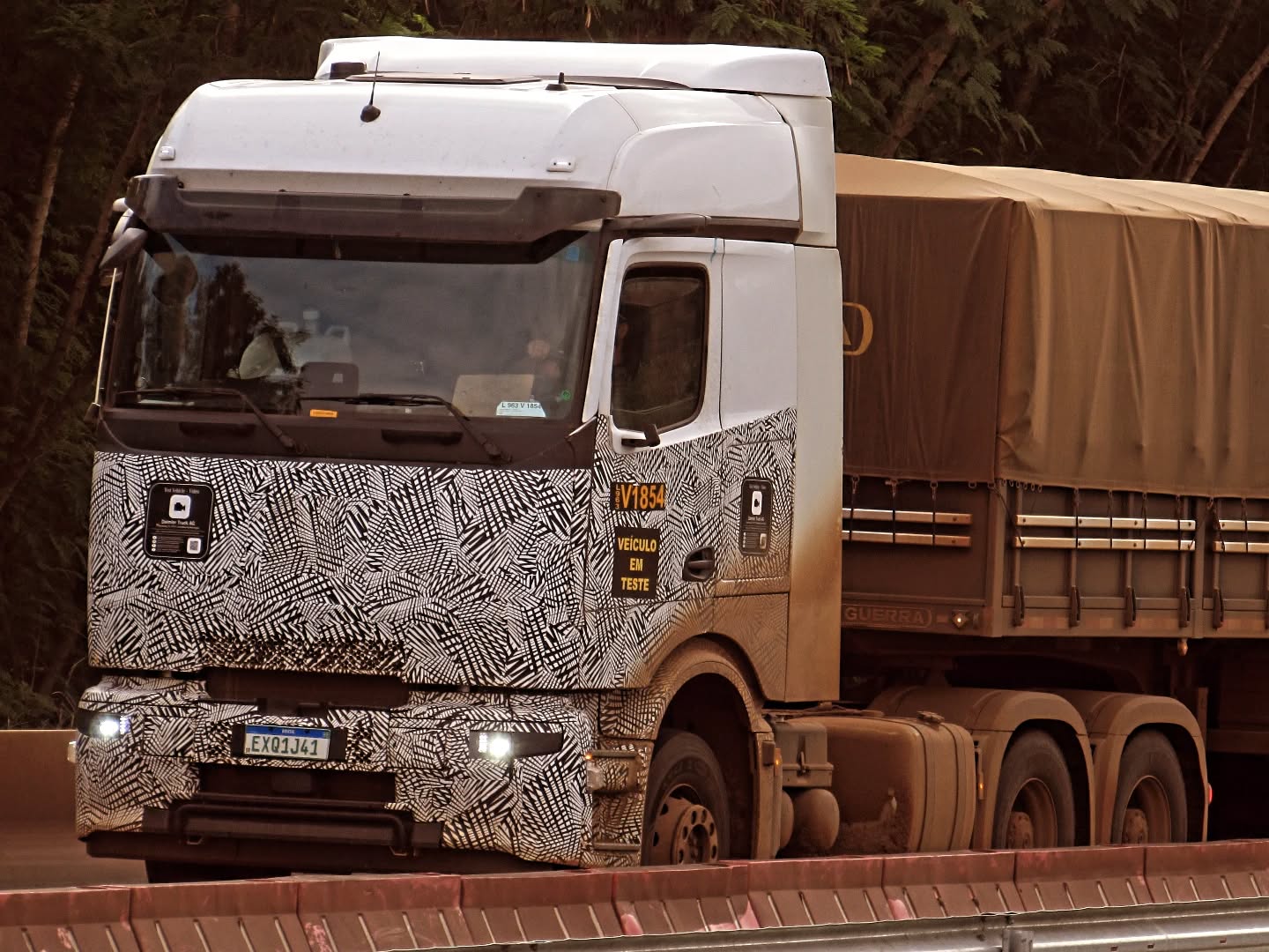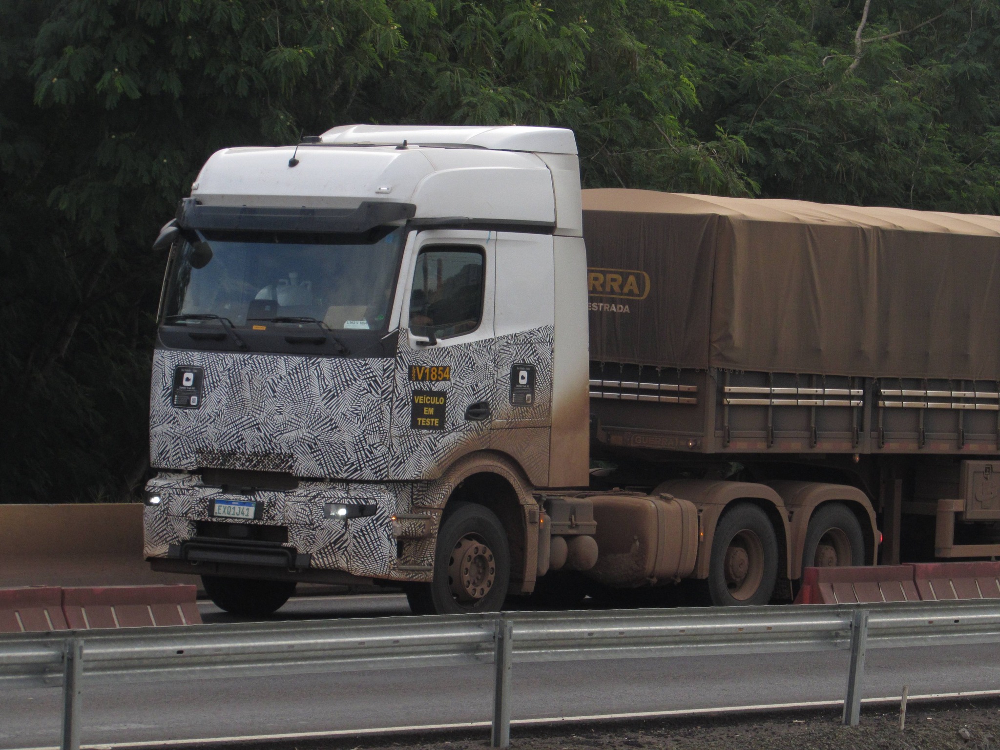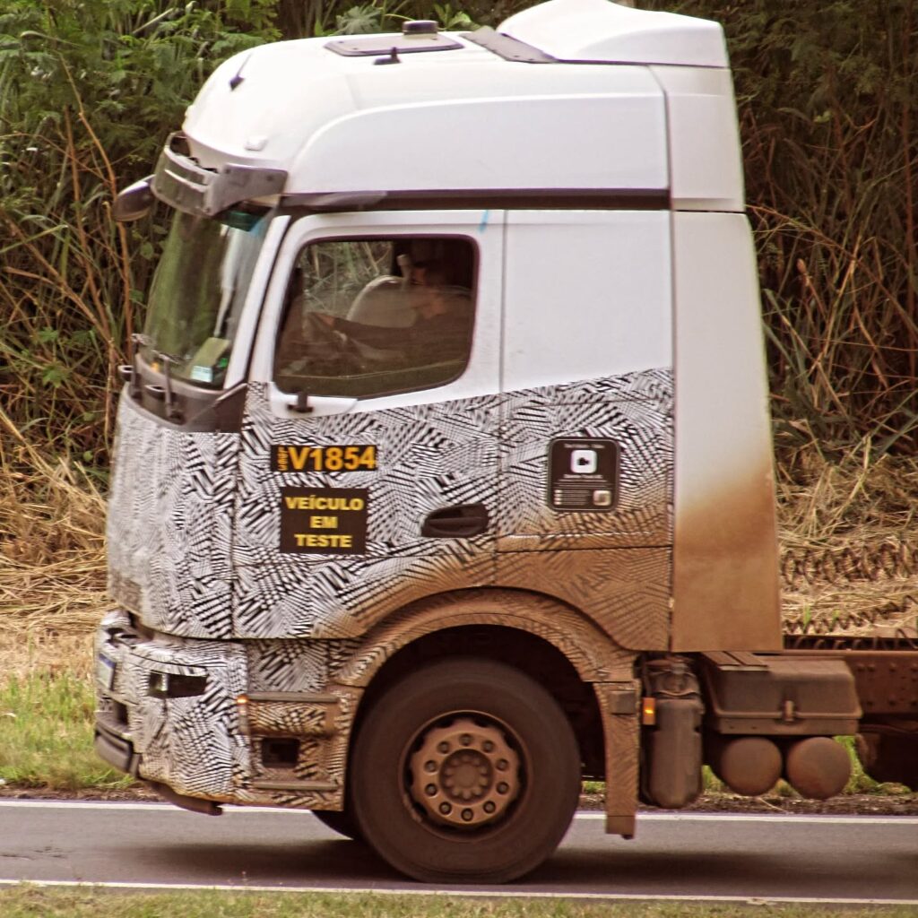 Now Mercedes is testing a lower version of the ProCabin in Brazil, where we found these photo’s. That would be a great match with the eActros 600 driveline and battery’s! The cab is the 2,5 meter wide version that we know from the Actros F, but now with the streamlined ProCabin front. The lower part of the cab seems to be completely new, and has a different design.