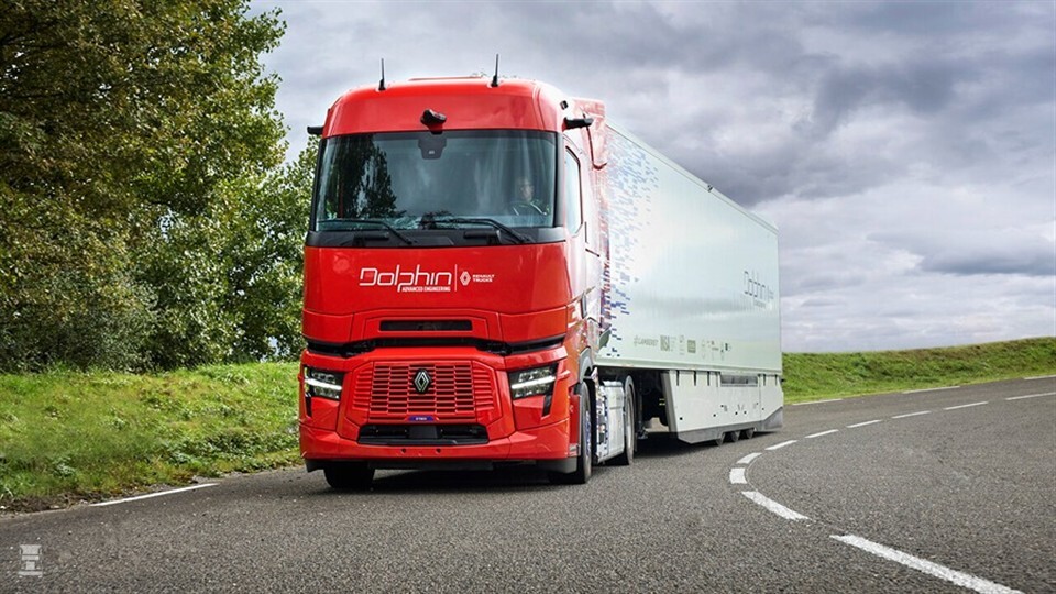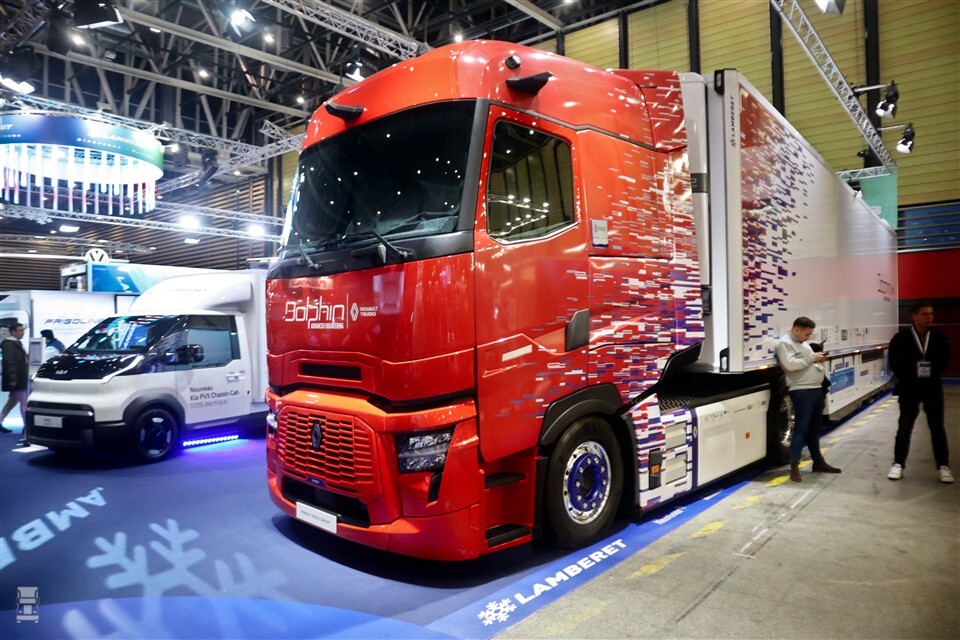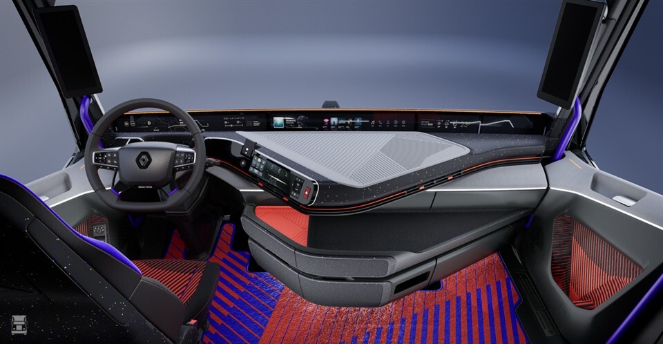 The truck was on the Lamberet stand, and at Renault Trucks we got no reaction to our questions. The truck has the new, streamlined front that we know of the e-Tech electric trucks with the low sleeper cab. Also the interior is new, with a LCD screen over the full width of the cab.
