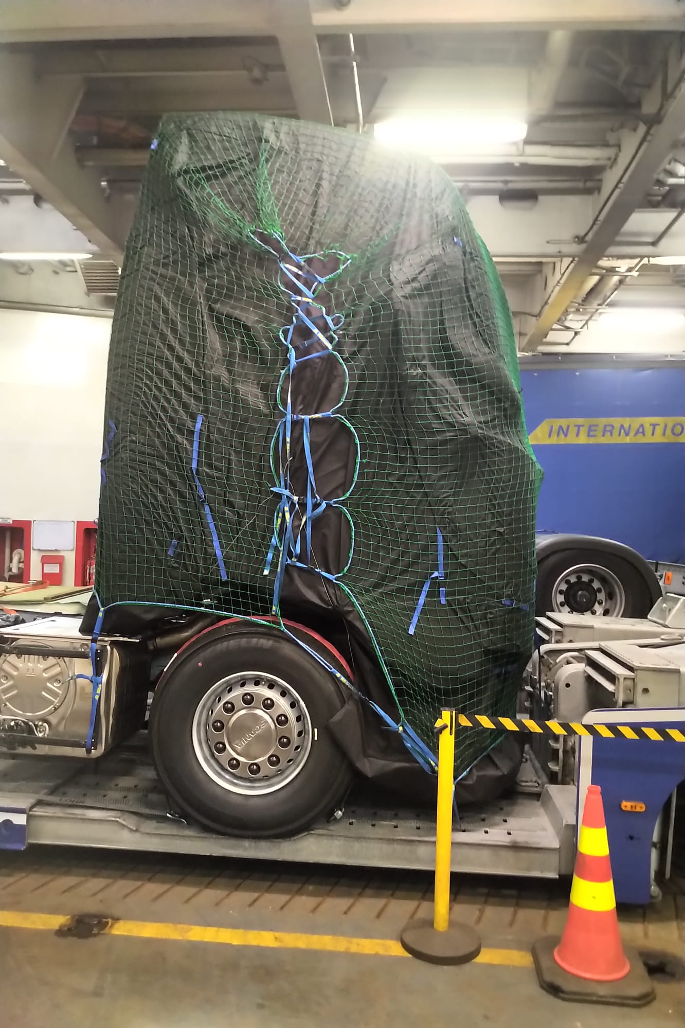 this Scania was caught by Paul Bennink on a ferry to Germany. The camouflage is very effective but we can see a round shaped front underneath. Probably the truck is on its way to a windtunnel in The Netherlands. Thanks to Paul and Alexmiedema.nl for the photos.